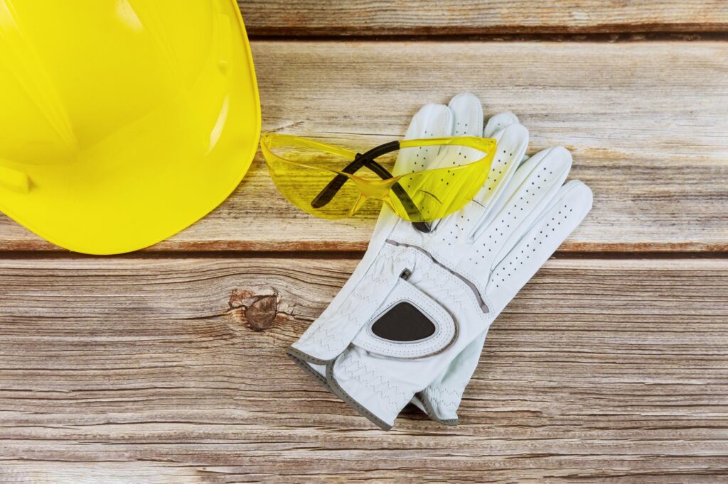 Elmetto di sicurezza, occhiali e guanti, come dpi di terza categoria, su assi di legno.